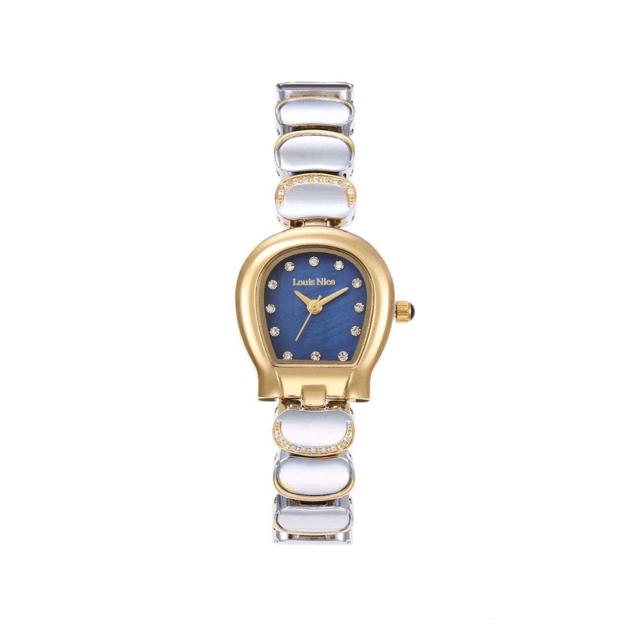 ساعة نسائية بتصميم راقٍ يجمع بين الفخامة والنعومة، مرصّعة بحبات لامعة مع مينا أزرق أنيق ولمسة ذهبية تزيدها تميزًا. خيار مثالي لإطلالتك اليومية والمناسبات الخاصة.